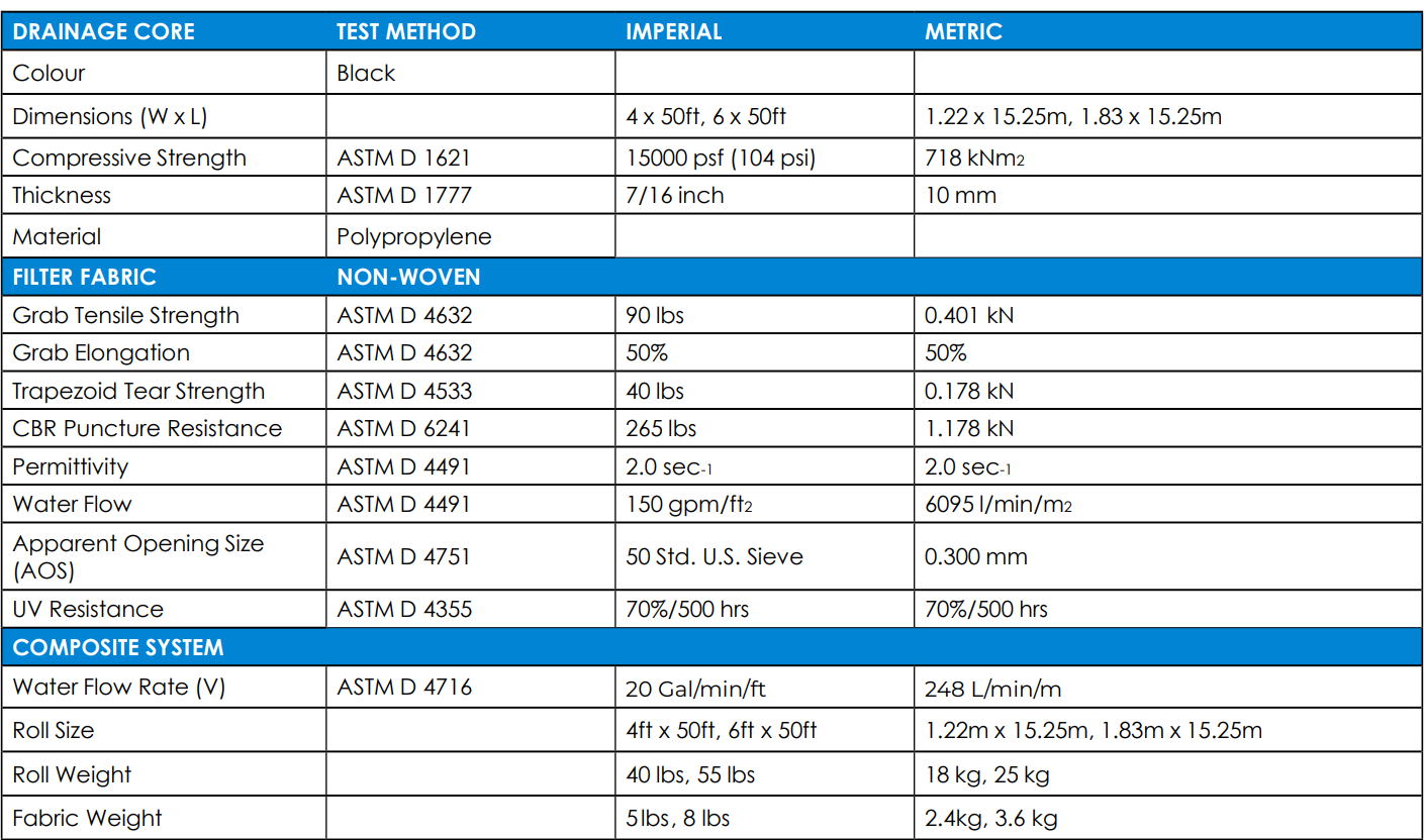 20 gal/min/ft of width and a compressive strength of 15,000lbs/sq ft.