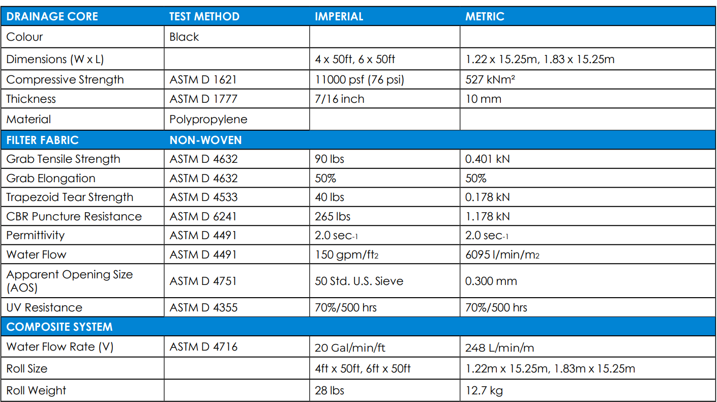 of 18 gal/min/ft of width and a compressive strength of 11,000lbs/sq ft. Polypropylene is highly resistant to