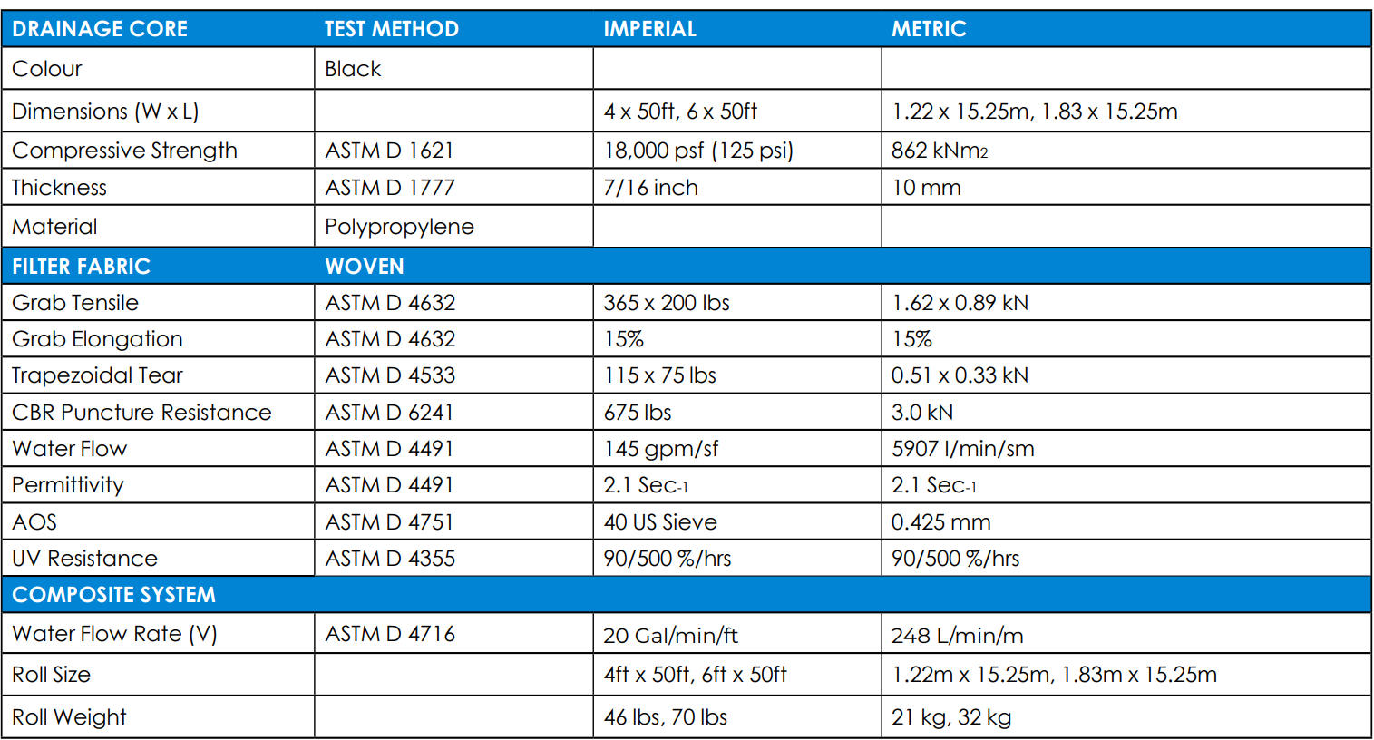 dimple height, providing a drainage capacity of 18 gal/min/ft of